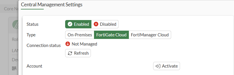 Set Status to Enabled, and set Type to FortiGate Cloud. FortiGate Cloud.