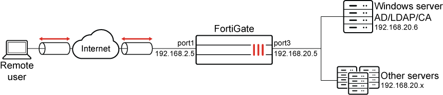 This method is more scalable because only one PKI user needs to be created on the FortiGate. Remote users connect with their unique user certificate that are matched against users in the LDAP server.