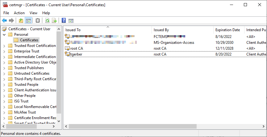Open the Windows certificate manager (certmgr):