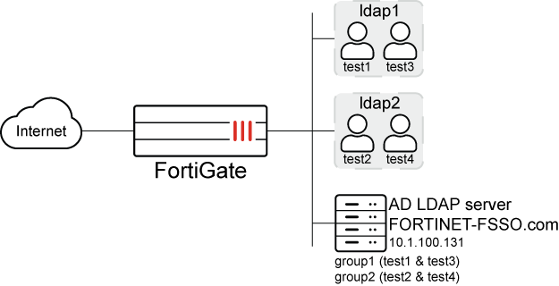 The Active Directory LDAP server, FORTINET-FSSO.com, is configured with two groups that contain two users each: group1 consists of users test1 and test3; group2 consists of users test2 and test4.