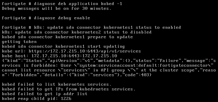 config system sdn-connector edit "kubernetes1" set type kubernetes set server <IP address> set server-port <port> set secret-token <secret token> set update-interval 30 next end -