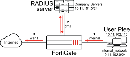 The FortiGate contacts the RADIUS server for the user's information. Once confirmed, the user can access the Internet. Each step generates logs that enable you to verify that each step succeeded.