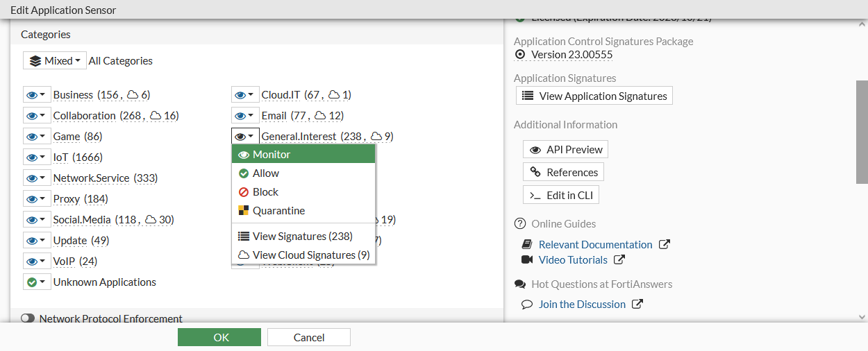 Go to Security Profiles > Application Control and edit a profile. On the Edit Application Sensor page in the Categories section, the eye icon next to a category means that category is monitored and logged.