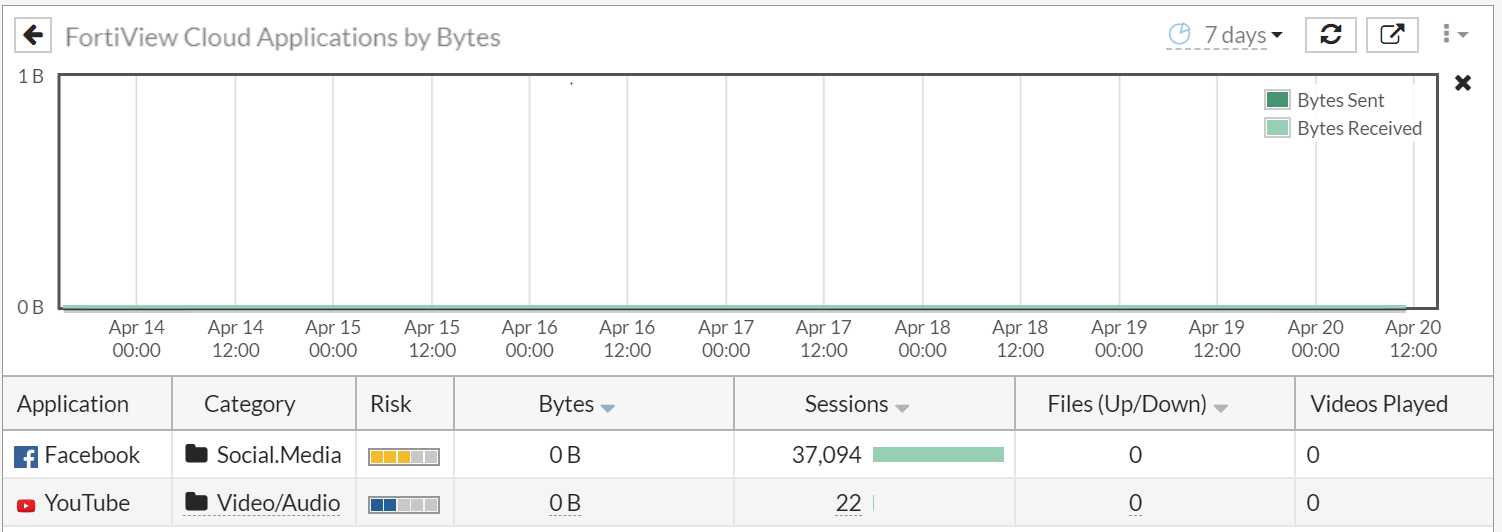 Open the monitor. If SSL deep inspection is enabled in the related firewall policy, then the monitor shows the additional details that are logged, such as Files (Up/Down) and Videos Played.
