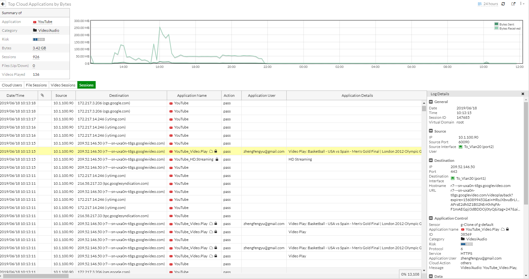 Sessions monitored by SSL deep inspection (in this example, Youtube_Video.Play) captured deep information such as Application User, Application Details, and so on. The Log Details pane also shows additional deep information such as application ID, Message, and so on.