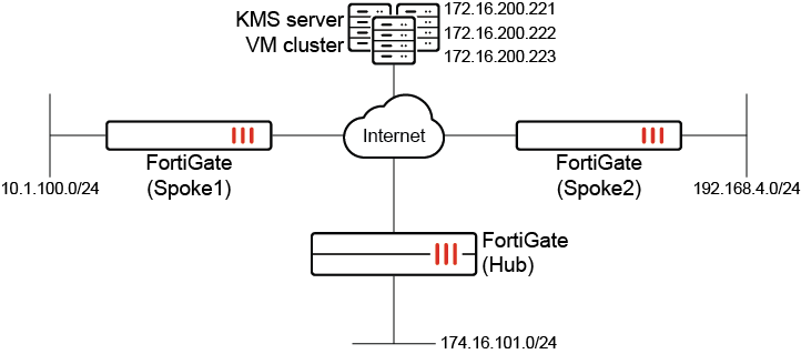 In this example, there is a topology with an ADVPN hub FortiGate and two spoke FortiGates. There is a cluster or three KMS server VMs (172.16.200.221, 172.16.200.222, and 172.16.200.223) that operates in round-robin mode. The testuser1_Cert certificate is issued by the KMS server, and the testuser1 user is defined on the KMS server. Authentication to the KMS server by the KMIP client requires both a certificate and a password.