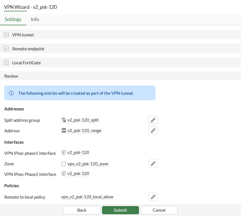 config firewall policy edit 1 set name "vpn_v2_psk-120_local_allow" set srcintf "vpn_v2_psk-120_zone" set dstintf "port3" set action accept set srcaddr "v2_psk-120_range" set dstaddr "internal network" set schedule "always" set service "ALL" set nat enable next end