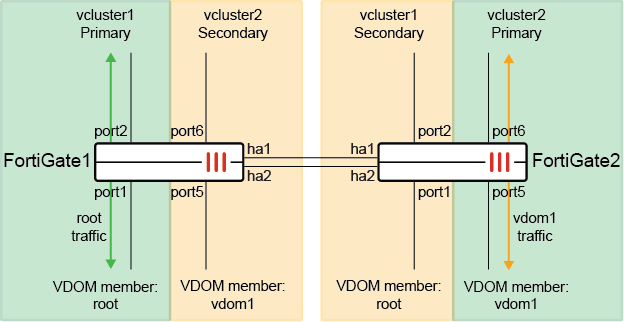 In an active-passive virtual cluster of two FortiGates, the first and second FortiGates share traffic processing according to the VDOM partitioning configuration. The following is an example of two virtual clusters, with each member acting as primary for different vclusters.