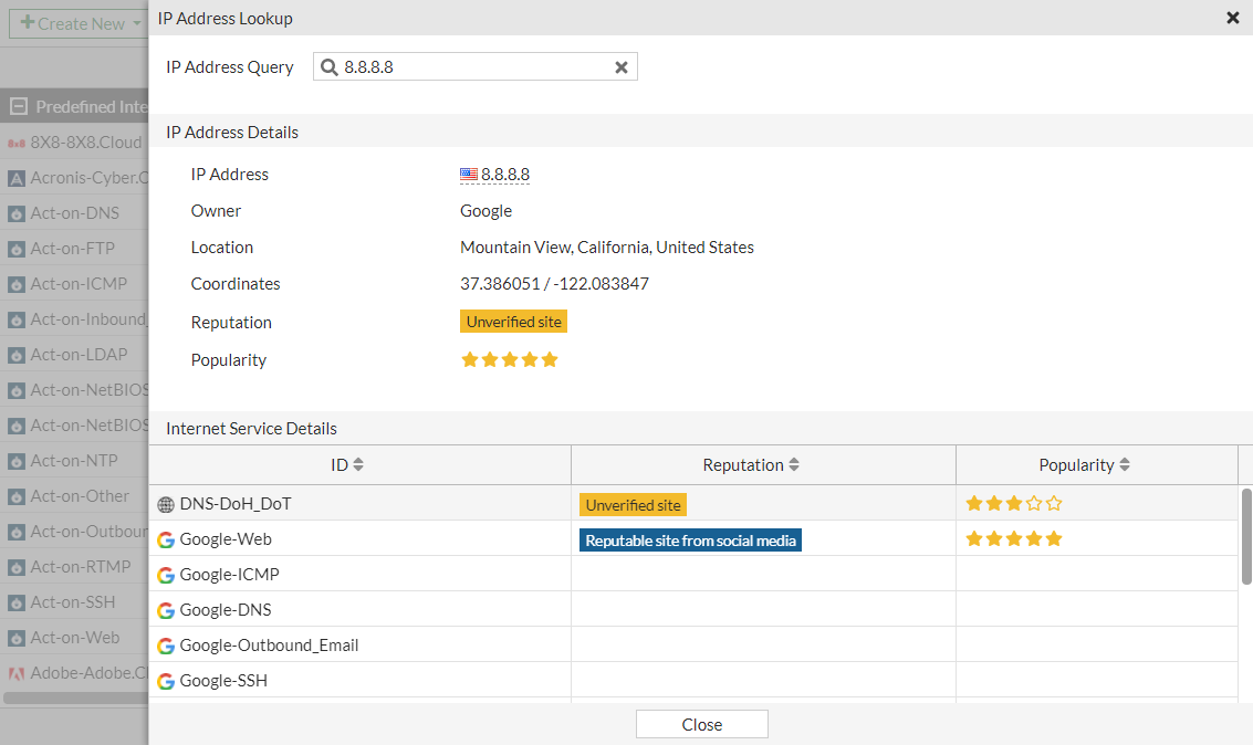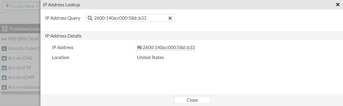 The IP Address Lookup button allows users to look up IP address information from the Internet Service Database and GeoIP Database. Returned IP address information includes the reverse IP address/domain lookup, location, reputation, and other internet service information.