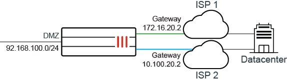 In this example, a customer has two ISP connections, wan1 and wan2. wan1 is used primarily for direct access to internet applications, and wan2 is used primarily for traffic to the customer's data center.