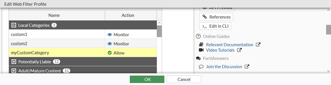 After configuring category override rules, an override category must be active in a web filter profile for it to take effect. Whether a category is active or not depends on the override method and action: