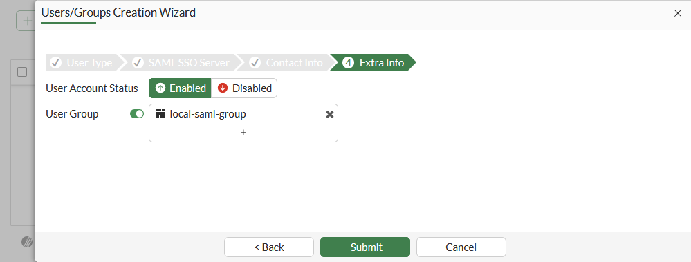 config user local edit "facusr" set type saml set saml-server "FW-saml-fac" next end -