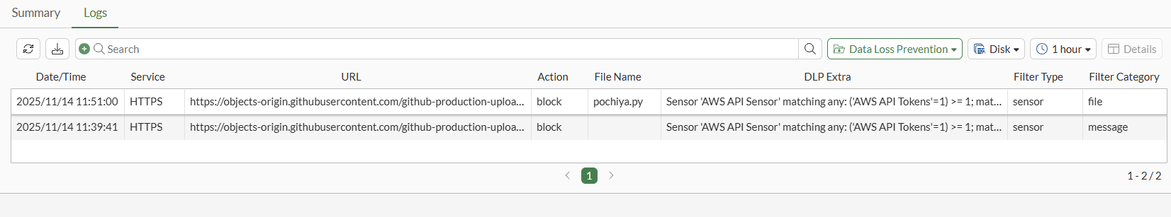 1: date=2025-11-14 time=11:51:00 eventtime=1763077860331286861 tz="+1200" logid="0954024576" type="utm" subtype="dlp" eventtype="dlp" level="warning" vd="root" ruleid=1 rulename="AWS API Profile" dlpextra="Sensor 'AWS API Sensor' matching any: ('AWS API Tokens'=1) >= 1; match." filtertype="sensor" filtercat="file" severity="critical" policyid=1 poluuid="3c57da8c-c0de-51f0-6f4a-95b898d269b3" policytype="policy" sessionid=28834 epoch=834063557 eventid=1 srcip=10.10.10.10 srcport=53912 srccountry="United States" srcintf="port2" srcintfrole="undefined" srcuuid="d2f06fda-15e7-51ee-0d22-faaf5170dad2" dstip=140.82.113.21 dstport=443 dstcountry="United States" dstintf="port1" dstintfrole="undefined" dstuuid="d2f06fda-15e7-51ee-0d22-faaf5170dad2" proto=6 service="HTTPS" filetype="python" direction="outgoing" action="block" hostname="objects-origin.githubusercontent.com" url="https://objects-origin.githubusercontent.com/github-production-upload-manifest-file-7fdce7" agent="Mozilla/5.0 (X11; Ubuntu; Linux x86_64; rv:135.0) Gecko/20100101 Firefox/135.0" httpmethod="POST" referralurl="https://github.com/" filename="pochiya.py" filesize=2338 profile="AWS API Profile"