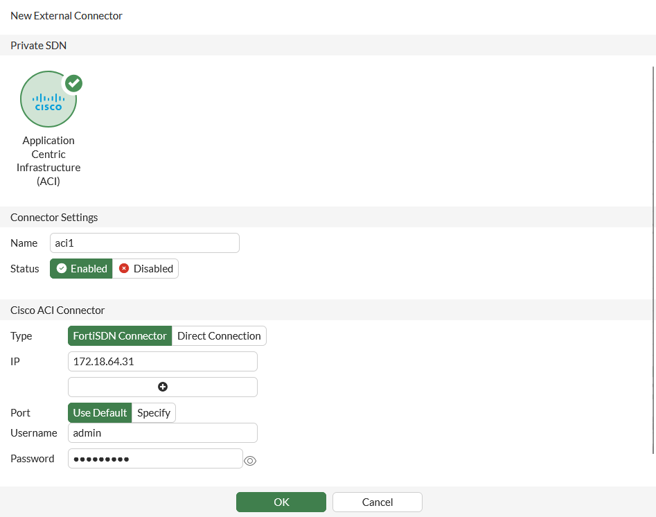 - In the Cisco ACI Connector section, for Type, select FortiSDN Connector and configure the remaining settings as needed.