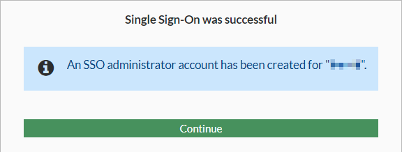 - A prompt appears that an SSO administrator account has been created. Click Continue.