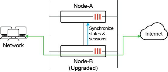 Administrators can manually trigger failover to make Node-B the new primary when ready. This can be done by resetting the HA uptime or changing device priorities, whichever method is desired. Traffic now passes through Node-B.