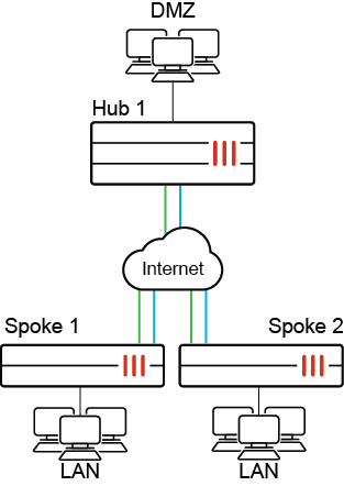 In this example, Spoke1 and Spoke2 each have four VPN tunnels that are connected to the Hub with ADVPN. The Spoke-Hub has established four BGP neighbors on all four tunnels.