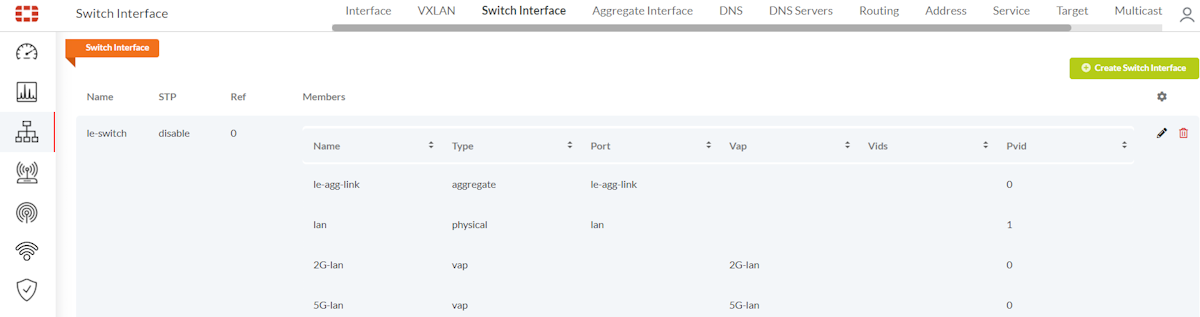 Go to Switch Interface, and verify that the device received the WiFi interface for the LAN extension. In this example, the WiFi interface is named 2G-lan.