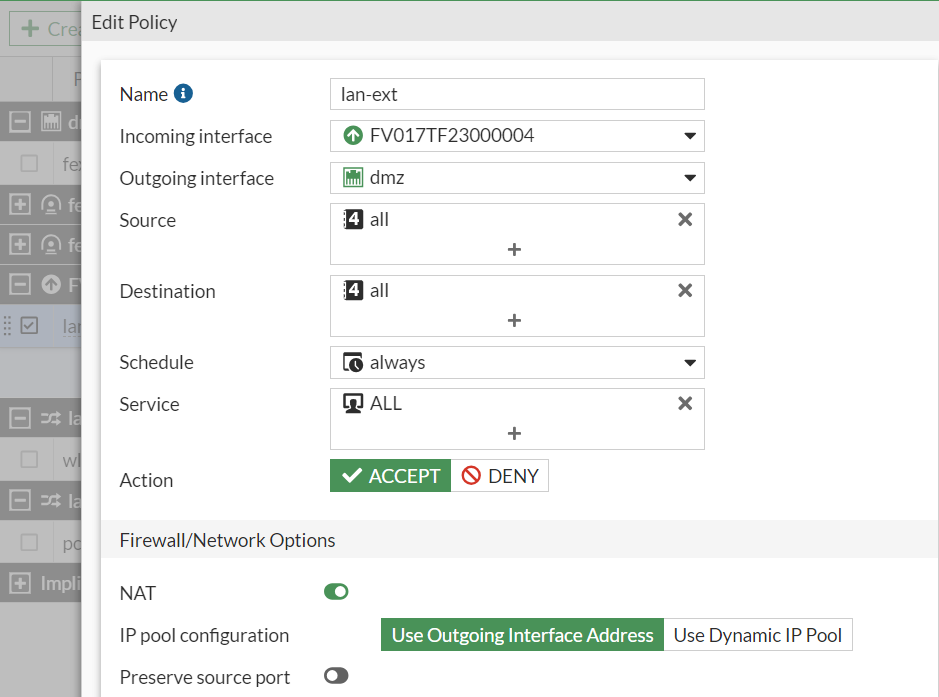 Go to Policy & Objects > Firewall Policy and double-click the LAN extension policy to open it for editing.