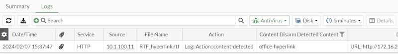In the following example, an AntiVirus log file includes a CDR event for an embedded hyperlink in an RTF file.