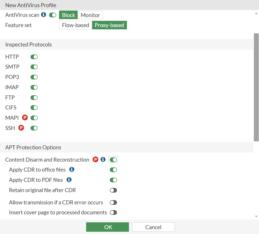 Under APT Protection Options, enable Content Disarm and Reconstruction.