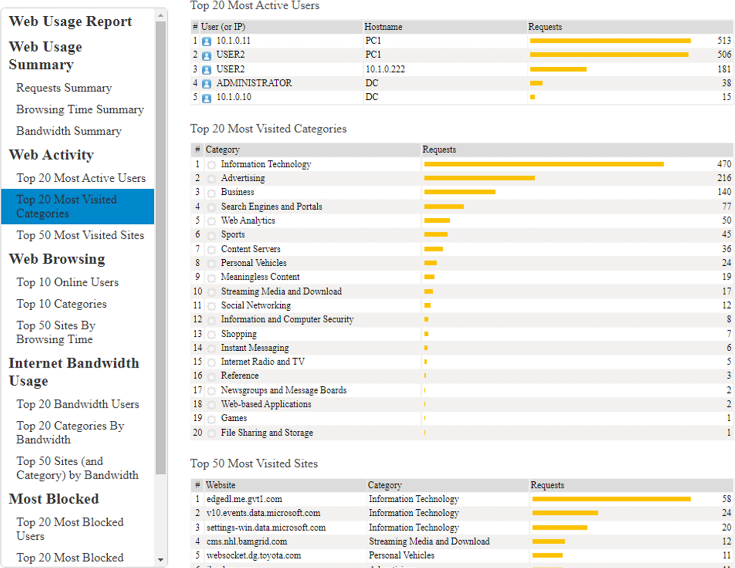 The Web Usage report includes all usernames and IP addresses that match the specified conditions, like most visited categories.