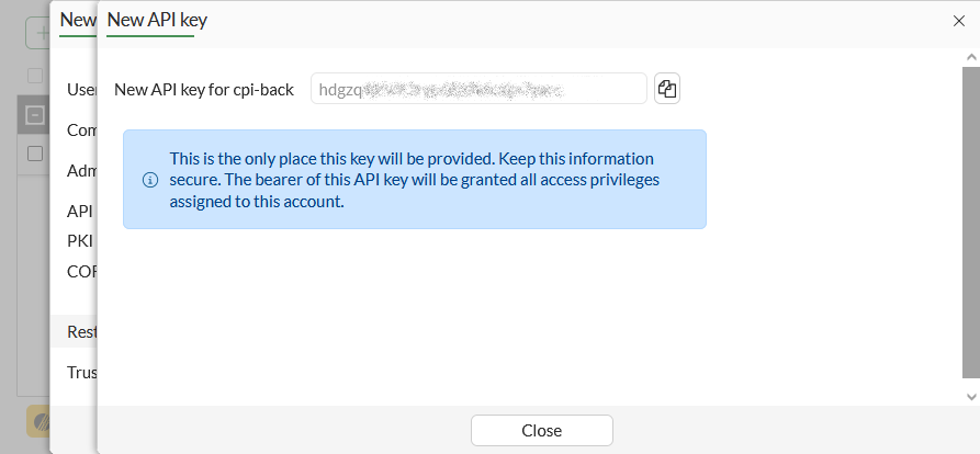 NOTE: The bearer of this API key will be granted all access privileges assigned to the api-user cp-api.