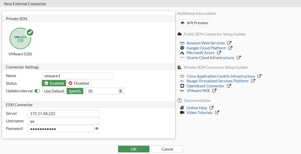 config system sdn-connector edit "vmware1" set type vmware set server "172.17.48.222" set username "example_username" set password xxxxx set update-interval 30 next end -