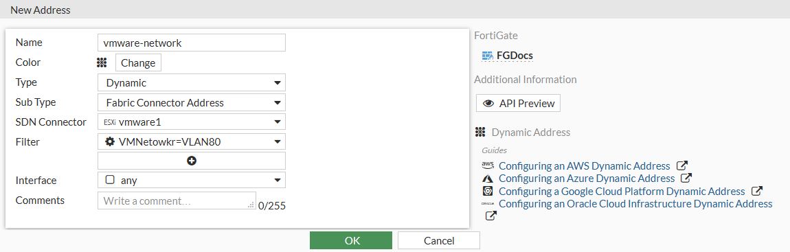config firewall address edit "vmware-network" set type dynamic set sdn "vmware1" set filter "vmnetwork=VLAN80" next end -