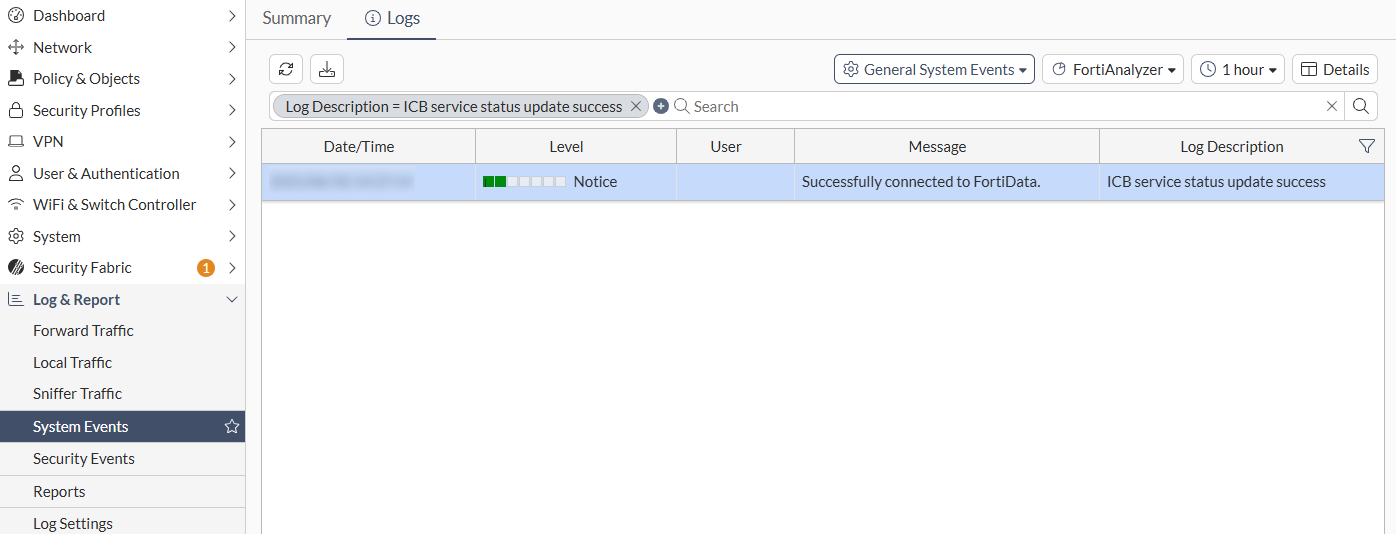 Go to the Log & Report > System Events page and verify the log stating that the FortiGate is successfully connected to the FortiData.