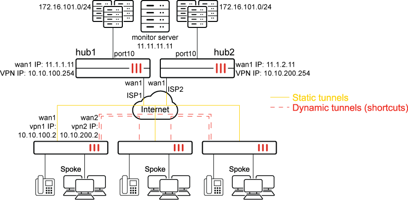Hub1 and Hub2 both use wan1 to connect to the ISPs and port10 to connect to internal network.