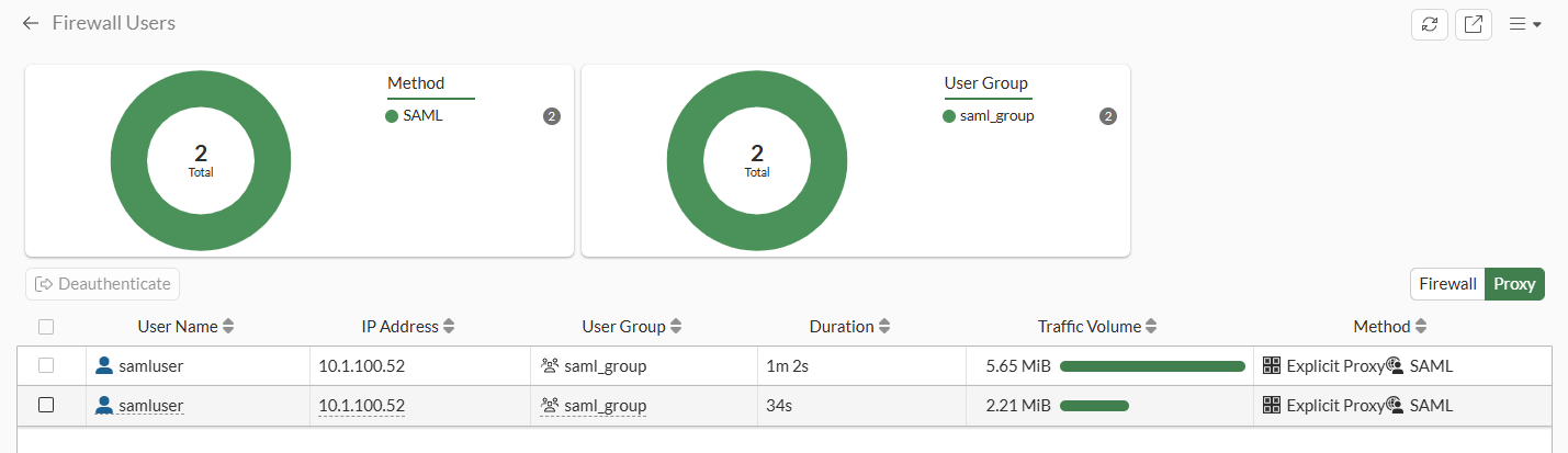 Go to Dashboard > Status and expand the Firewall Users widget. Observe the two user sessions: