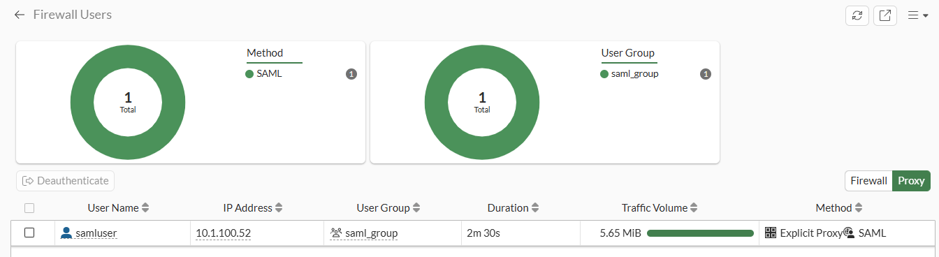 # diagnose wad user list ID: 2, VDOM: vdom1, IPv4: 10.1.100.52 user name : samluser worker : 22 duration : 133 auth_type : Session auth_method : SAML pol_id : 1 g_id : 10 user_based : 0 expire : no LAN: bytes_in=461676 bytes_out=5421755 WAN: bytes_in=5331434 bytes_out=597899