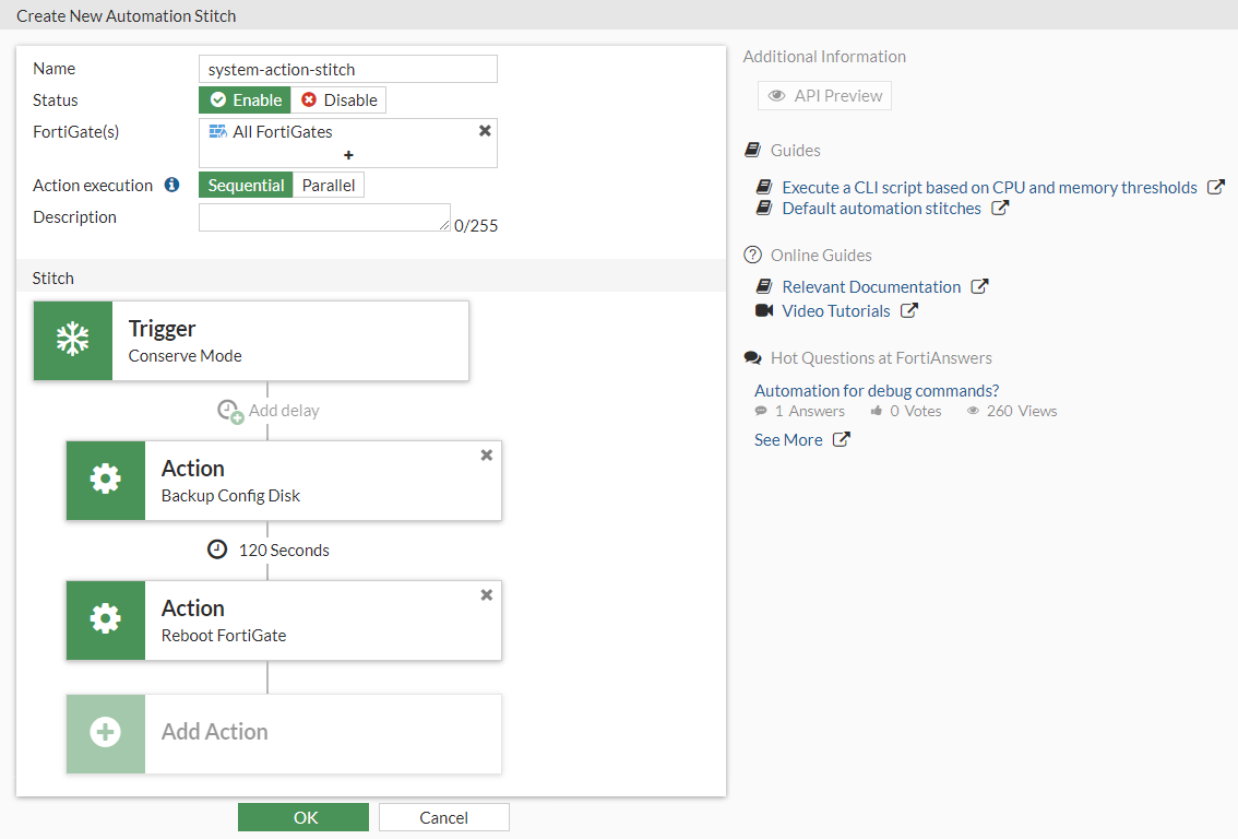 In this example, an automation stitch is created that uses the Conserve Mode trigger, a Backup Config Disk action to back up the configuration to the FortiGate's disk (see Configuration backups and reset for more details), and then a Reboot FortiGate action. There is a 120-second delay between the two actions.