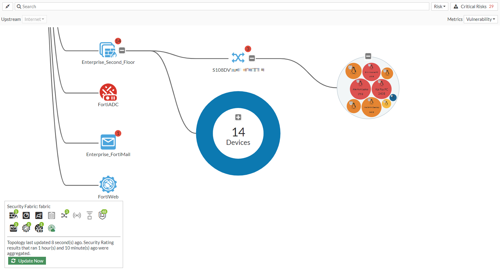 The full Security Fabric topology can be viewed on the root FortiGate. Downstream FortiGate devices' topology views do not include upstream devices.