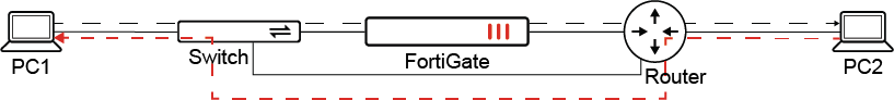 Traffic from PC1 to PC2 goes through the FortiGate, while traffic from PC2 to PC1 does not.