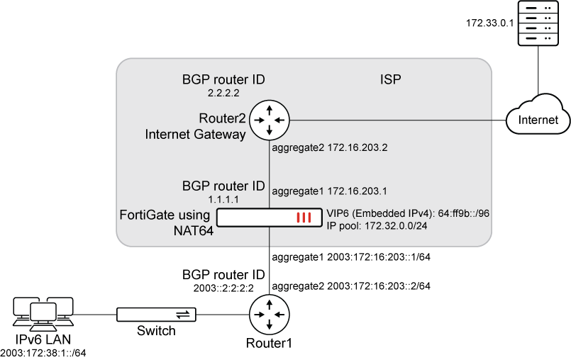 In this example, the FortiGate uses NAT64 where the LAN via Router1 uses IPv6 and where Router2 is the internet gateway using IPv4.