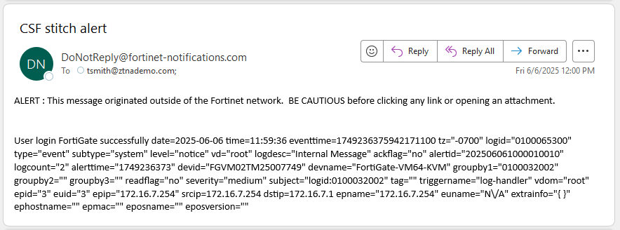 # diagnose debug application autod -1 # diagnose debug enable __handle_req_body()-109: subscriber update: name subscr-node msg_type 0 msg_len 309: {"format":0,"category_filter":2,"free_style":[{"category":"event","filter":"(logid 0100022040 0100065304 0100022041 0100065305 0100022042 0100065306 0100022043 0100022044 0100022045 0100022901 0100022902 0100022903 0100022808 0100022809 0100053400 0100053401 0100026004 0100065311)","filter_type":"include"}]} pid:2086-__handle_msg()-414: Subscriber:4 received package. pubid:0 pkgid:97 pkg_index:0 pid:2086-__handle_pkg_logs()-356: Subscriber:4 processing package size:1512 logs:1 pickup:1 pid:2086-__subscr_close_cur_pkg()-140: close package size:1512 logs:1 __action_email_hdl()-190: email action (auto-faz-1_email) is called. from: to:tsmith@ztnademo.com; subject:CSF stitch alertAn alert email is sent out and an automation stitch log is generated. The email sent by the action will look similar to the following: