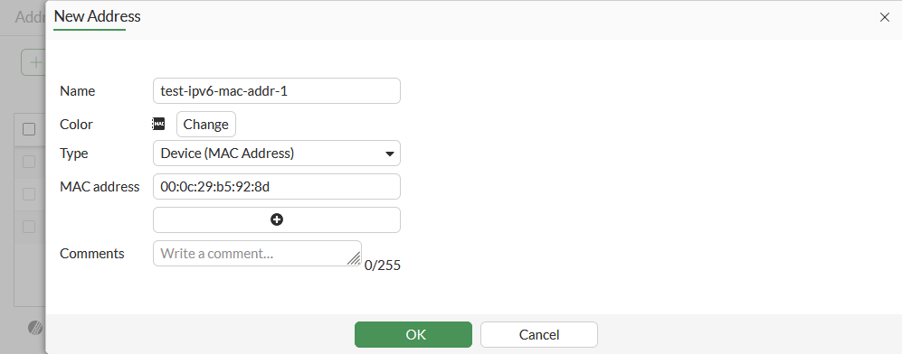 config firewall address6 edit "test-ipv6-mac-addr-1" set type mac set macaddr 00:0c:29:b5:92:8d next end -