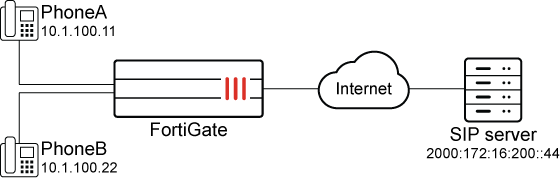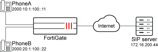 In this example, SIP phones on the internal network use IPv4, and the SIP server on an external network uses IPv6. NAT46 is used with SIP ALG to allow for seamless communication. A VoIP profile, sip, has already been created.