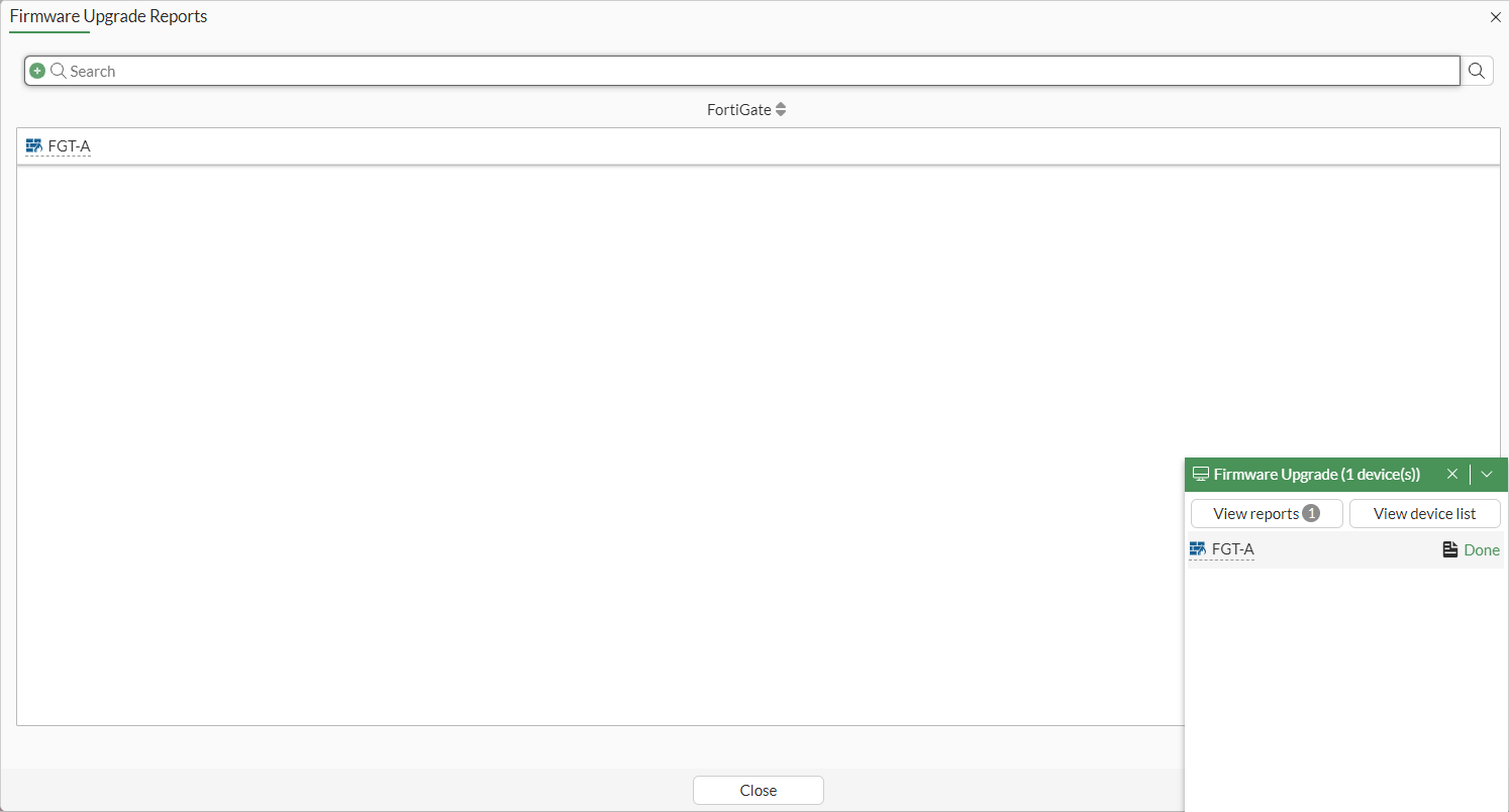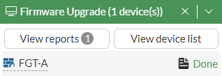 Click the View reports <number> button or the document icon beside Done. A Firmware Upgrade Reports pane opens to show the list of FortiGates with an available firmware upgrade report: