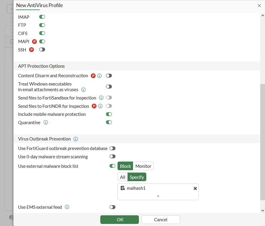 The quarantine setting is configured in each protocol (set quarantine). The malware external feed is also specified (set external-blocklist-enable-all disable) to the external connector, malhash1 (set external-blocklist "malhash1").