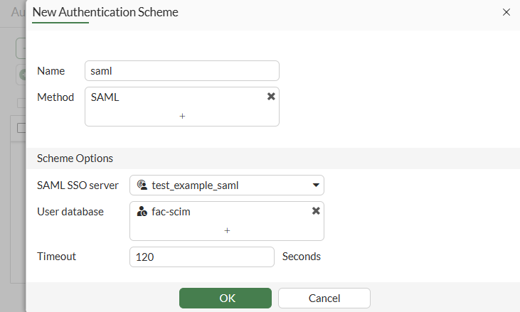 scim-clientas auser-database:config authentication scheme edit "saml" set method saml set saml-server "test_example_saml" set user-database "fac-scim" next end config authentication rule edit "saml" set srcaddr "all" set active-auth-method "saml" next end -