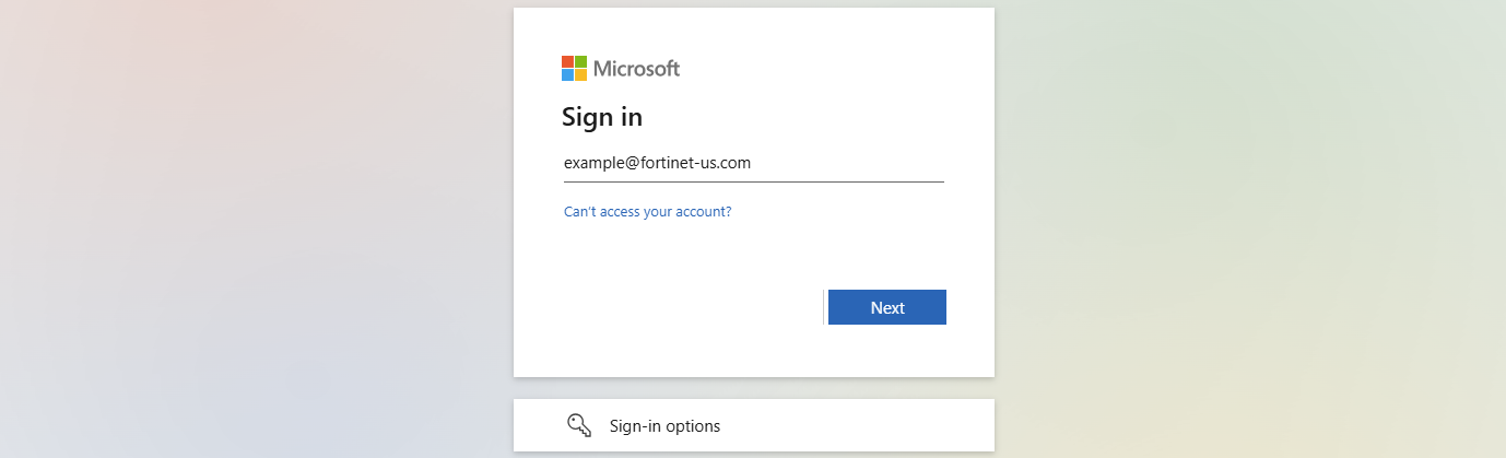 config firewall proxy-policy edit 1 set name "saml" set proxy explicit-web set dstintf "port3" set srcaddr "all" set dstaddr "all" set service "webproxy" set action accept set schedule "always" set logtraffic all set groups "saml" next endWhen a user goes to www.fortinet.com in a browser that is configured to use the FortiGate as a proxy, the authentication window will pop-up in the browser.
