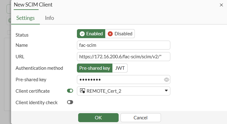config user scim edit "fac-scim" set status enable set base-url "https://172.16.200.6/fac-scim/scim/v2/" set auth-method base set secret ********** set certificate REMOTE_Cert_2 set client-identity-check disable next end