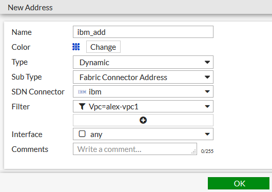 config firewall address edit "ibm_add" set type dynamic set sdn "ibm" set color 19 set filter "Vpc=alex-vpc1" next end -
