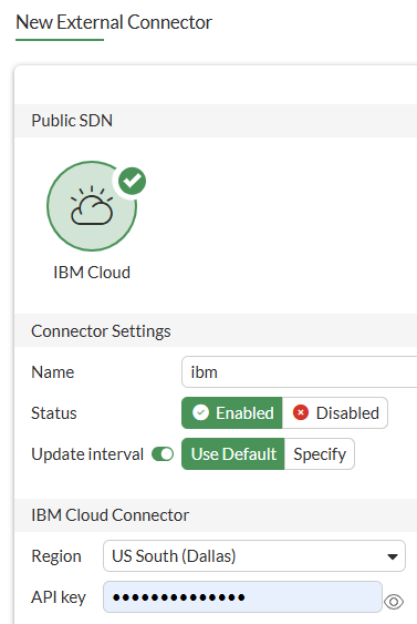 config system sdn-connector edit "ibm" set status enable set type ibm set api-key xxxxxx set ibm-region us-south set update-interval 60 next end -
