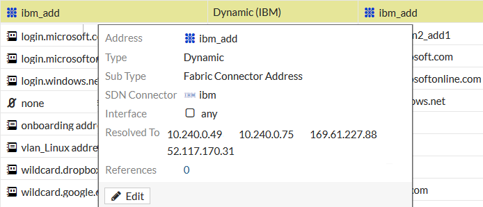 # show firewall address ibm_add config firewall address edit "ibm_gen1_add" set uuid 586841c4-7f46-51ea-dc66-dbf840af03d3 set type dynamic set sdn "ibm" set color 19 set filter "Vpc=alex-vpc1" config list edit "10.240.0.49" next edit "10.240.0.75" next edit "169.61.227.88" next edit "52.117.170.31" next end next end