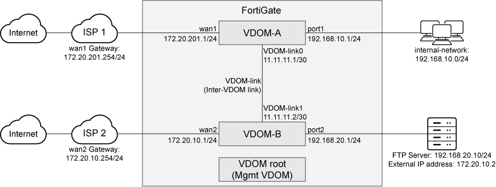 You can use VDOMs in either NAT or transparent mode on the same FortiGate. By default, VDOMs operate in NAT mode. In this example, both VDOM-A and VDOM-B use NAT mode. An inter-VDOM link is created and inter-VDOM routes configured to allow users on the internal network to access the FTP server.