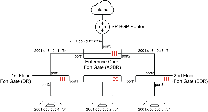Enterprise Core FortiGate redistributes BGP routes into the OSPF AS and peers with the ISP BGP Router over eBGP. For information about configuring BGP, see Basic IPv6 BGP example.